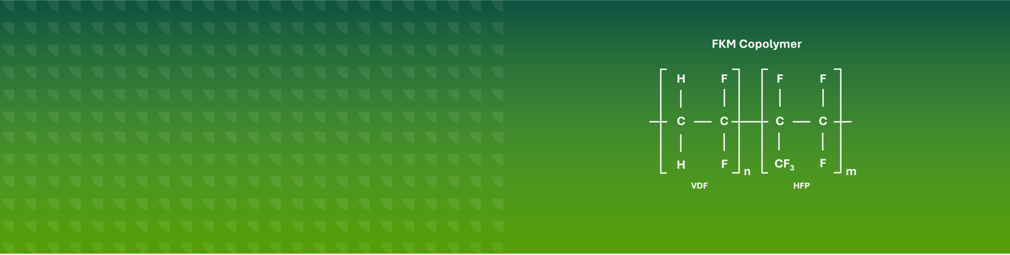Chemisch handelt es sich bei (Standard-)FKM um fluorierte Copolymere, bei denen Wasserstoffatome in der Polymerstruktur teilweise durch Fluoratome ersetzt sind. Der Aufbau erfolgt aus verschiedenen fluorhaltigen und teilfluorierten Monomeren, typischerweise Vinylidenfluorid (VDF), Hexafluorpropylen (HFP) sowie – bei höherwertigen Qualitäten – Tetrafluorethylen (TFE).
