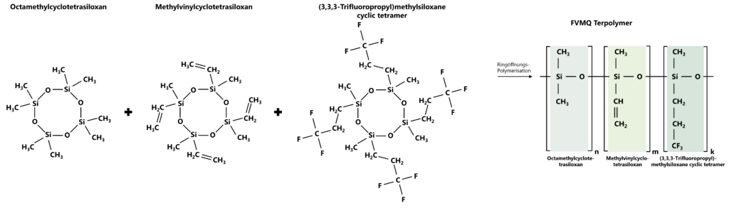 Abbildung 1: Chemischer Aufbau von FVMQ: Aus Octamethylcyclotetrasiloxan (links), Methylvinylcyclotetrasiloxan (links mittig) und 3,3,3-Trifluoropropyl Methylsiloxane Cyclic Tetramer (rechts mittig) entsteht durch Polymerisation das FVMQ-Terpolymer (rechts).