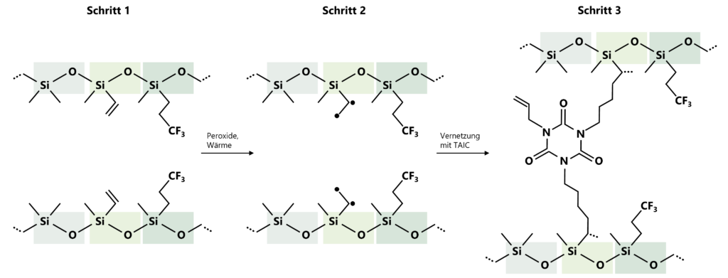 Abbildung 2: Lineare FVMQ-Polymerketten mit fluorierten Seitengruppen werden unter Peroxideinwirkung aktiviert und anschließend über TAIC zu einem dreidimensionalen siloxanbasierten Elastomernetzwerk vernetzt.